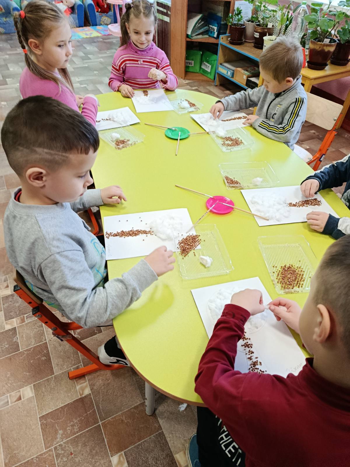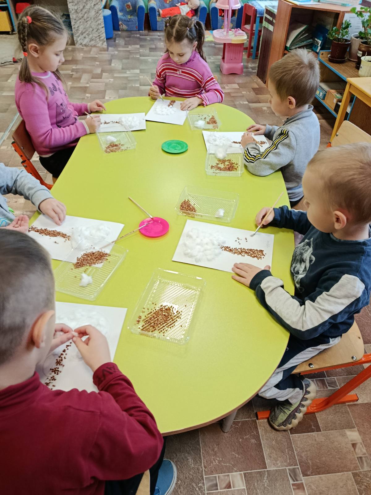 На занятии по образовательной области "Искусство" воспитанники группы интегрированного обучения и воспитания №2 на аппликации изготовили снежные деревья из гречневой крупы и ваты.
