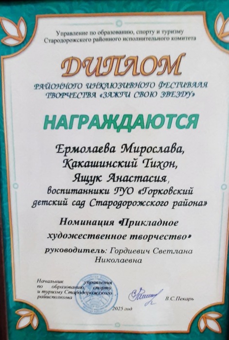 Воспитанники учреждения образования: Ермолаева Мирослава, Какашинский Тихон, Ящук Анастасия, награждены дипломом районного инклюзивного фестиваля творчества "Зажги свою звезду" в номинации "Прикладное художетсвенное творчество".